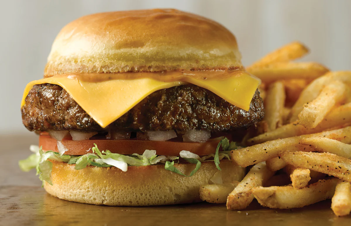 Beef patty with American cheese served with seasoned fries (add 380 cal).
