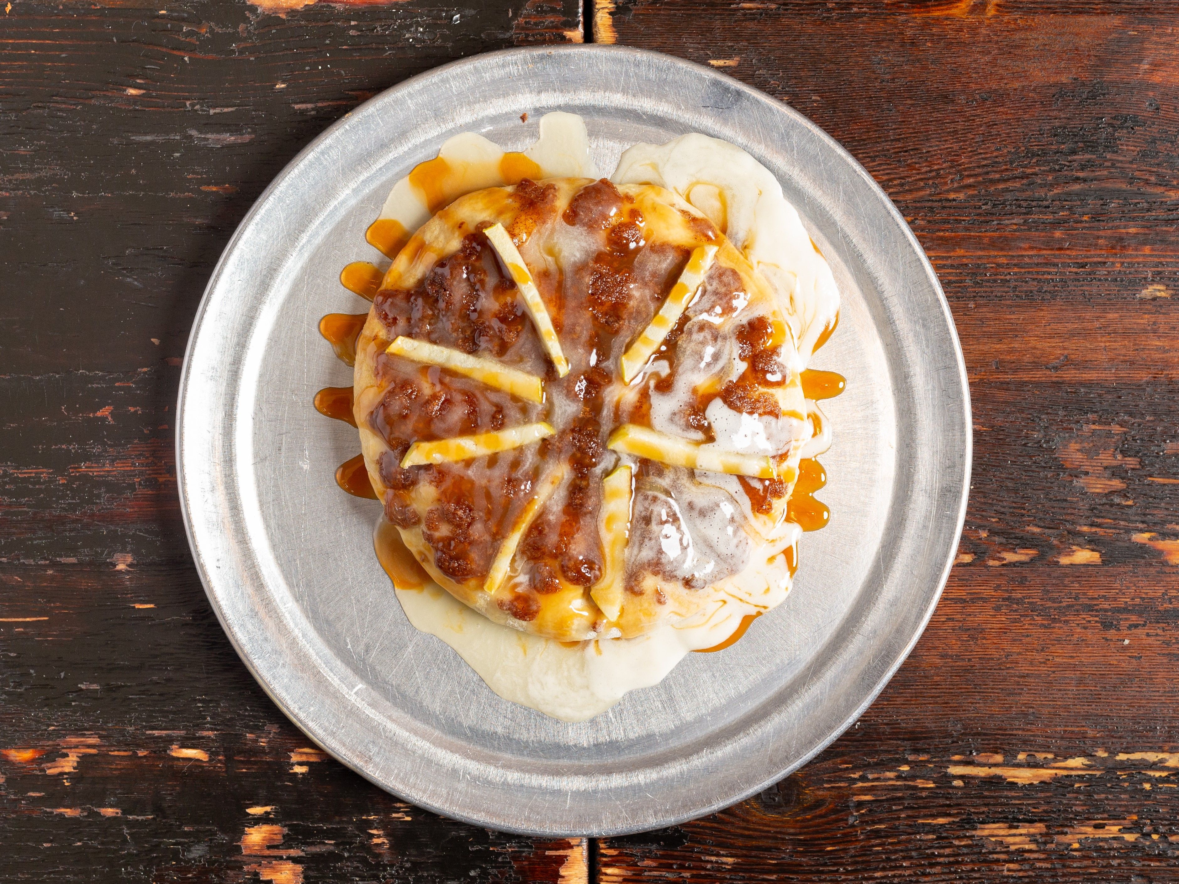 Dessert pizza topped with cinnamon sugar streusel, granny smith apples and caramel drizzle.