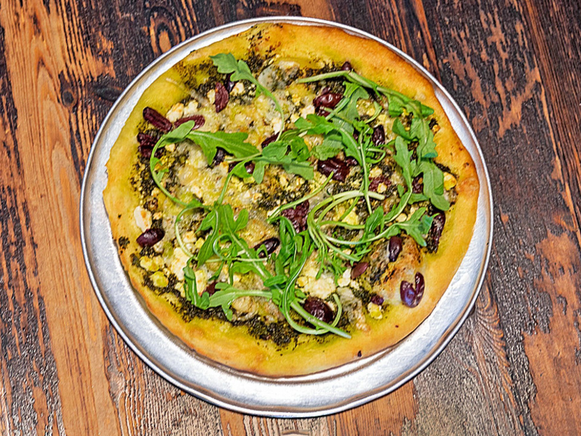 Pesto sauce, Feta Cheese, Parmigiano Cheese, Chicken, Kalamata Olives, Wild Arugula