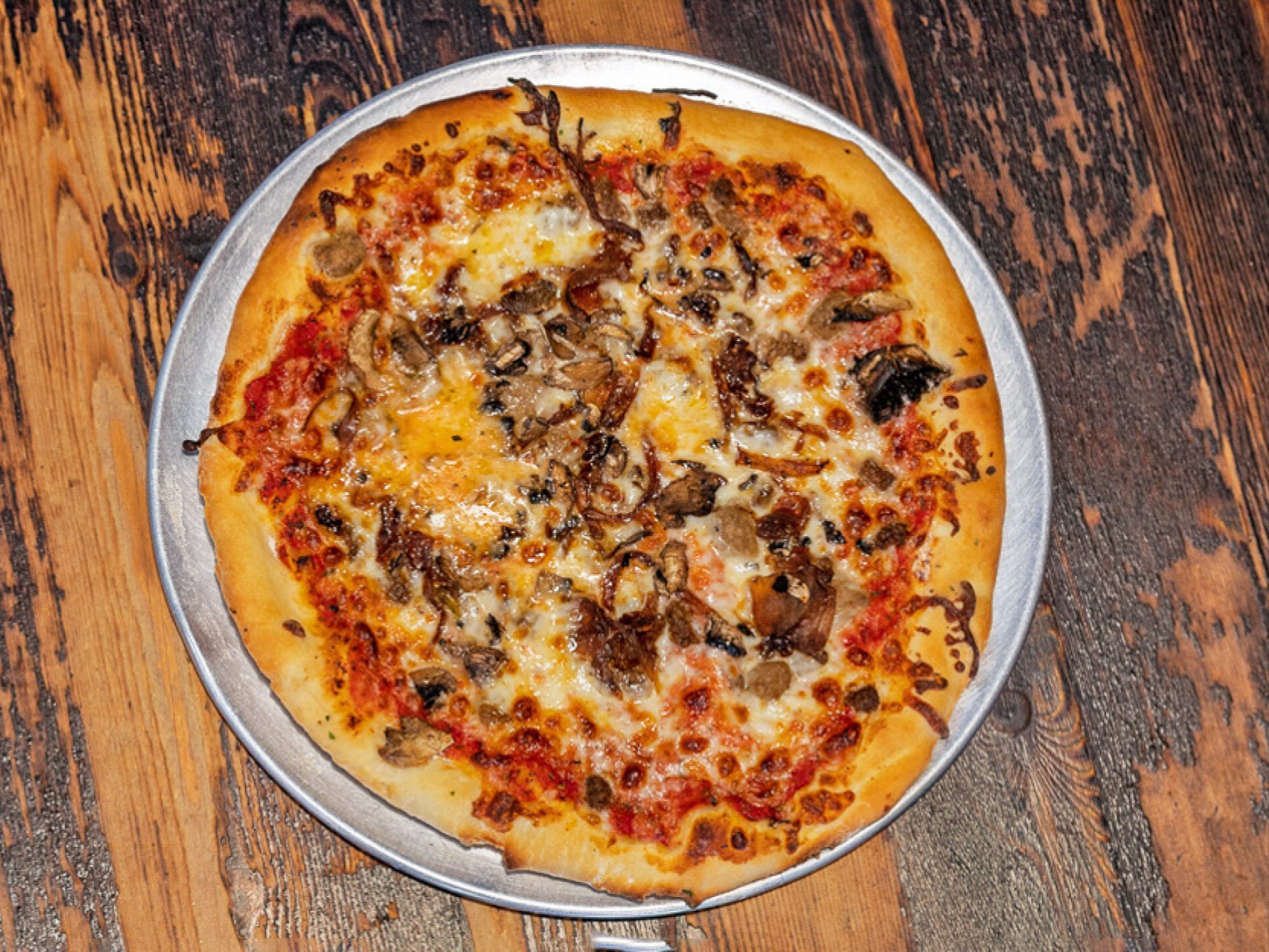 Classic Red, Shredded Motz, Beef Topping, Mushrooms, and Caramelized Onions,