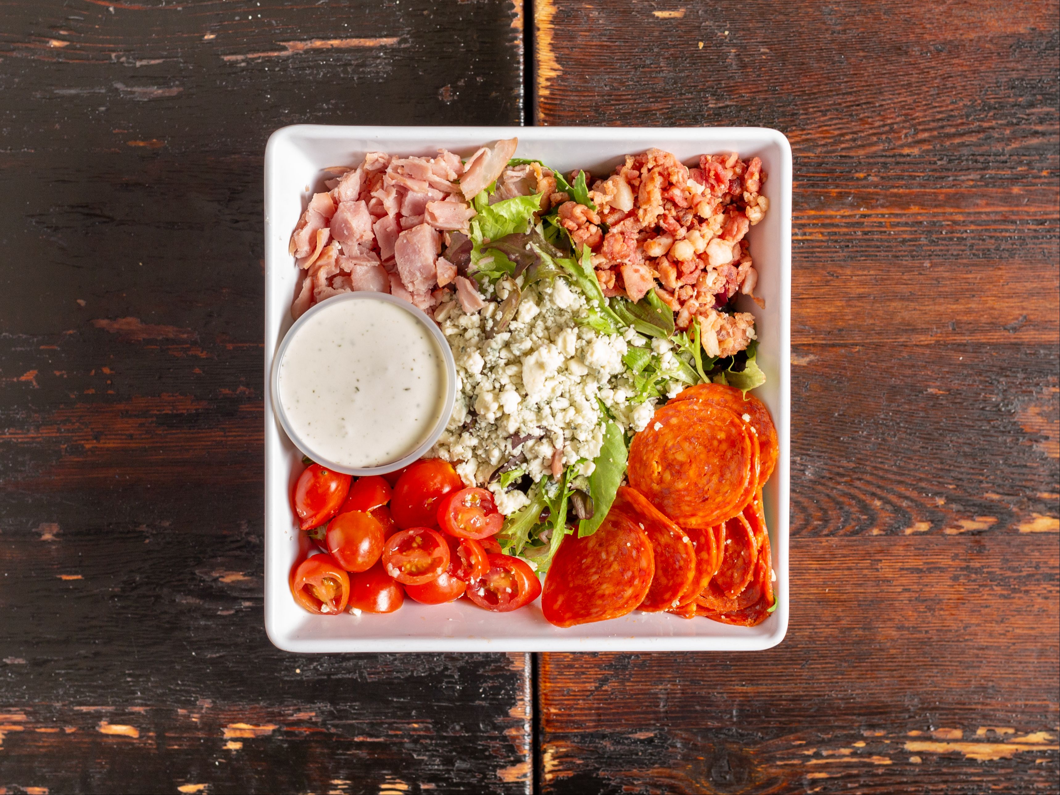 Mixed greens, bacon, pepperoni, ham, cherry tomatoes, Gorgonzola cheese, & homemade ranch.