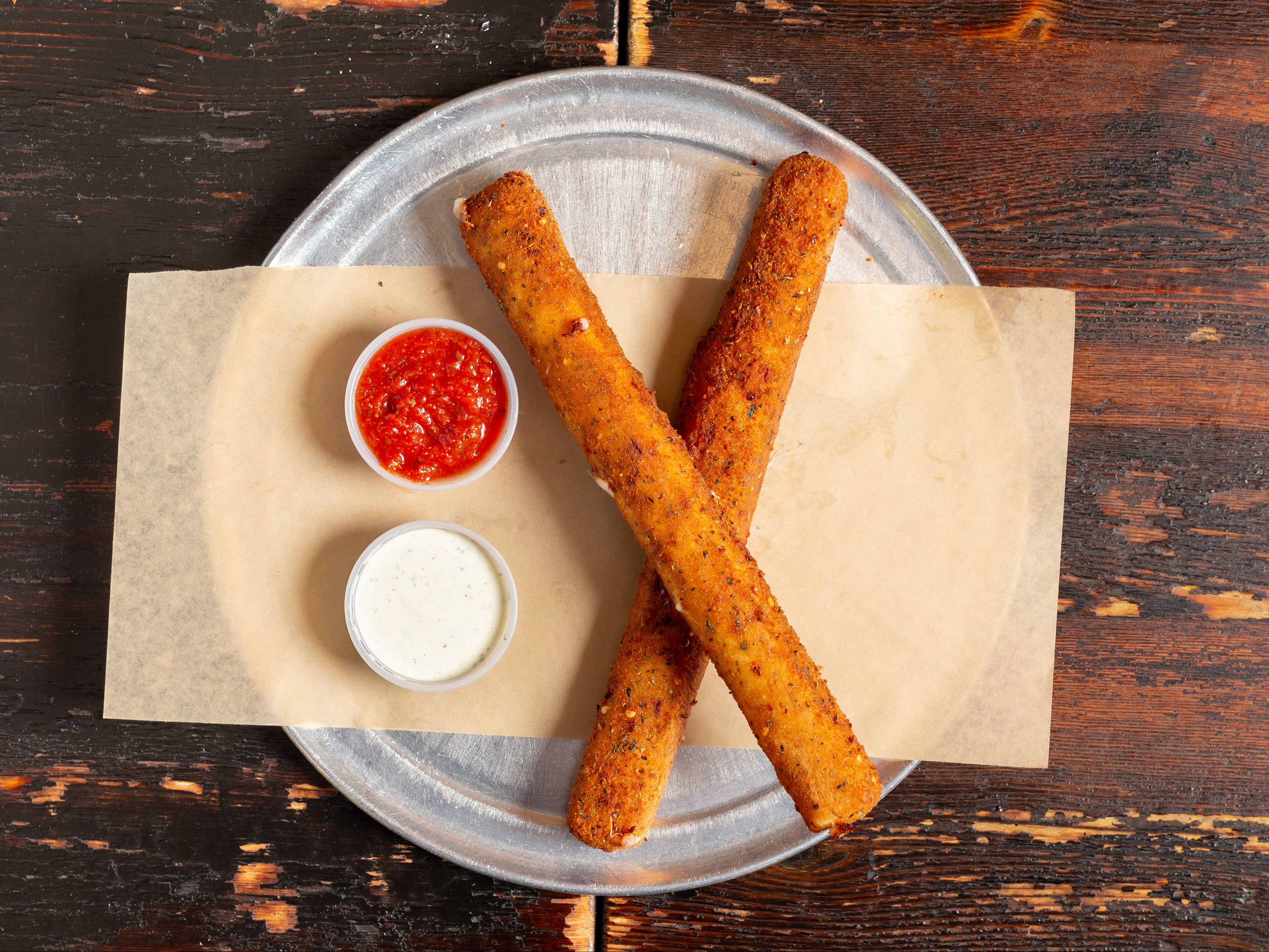 Two massive hand breaded mozzarella cheese stix with golden crust served with our homemade marinara and ranch sauce for dipping