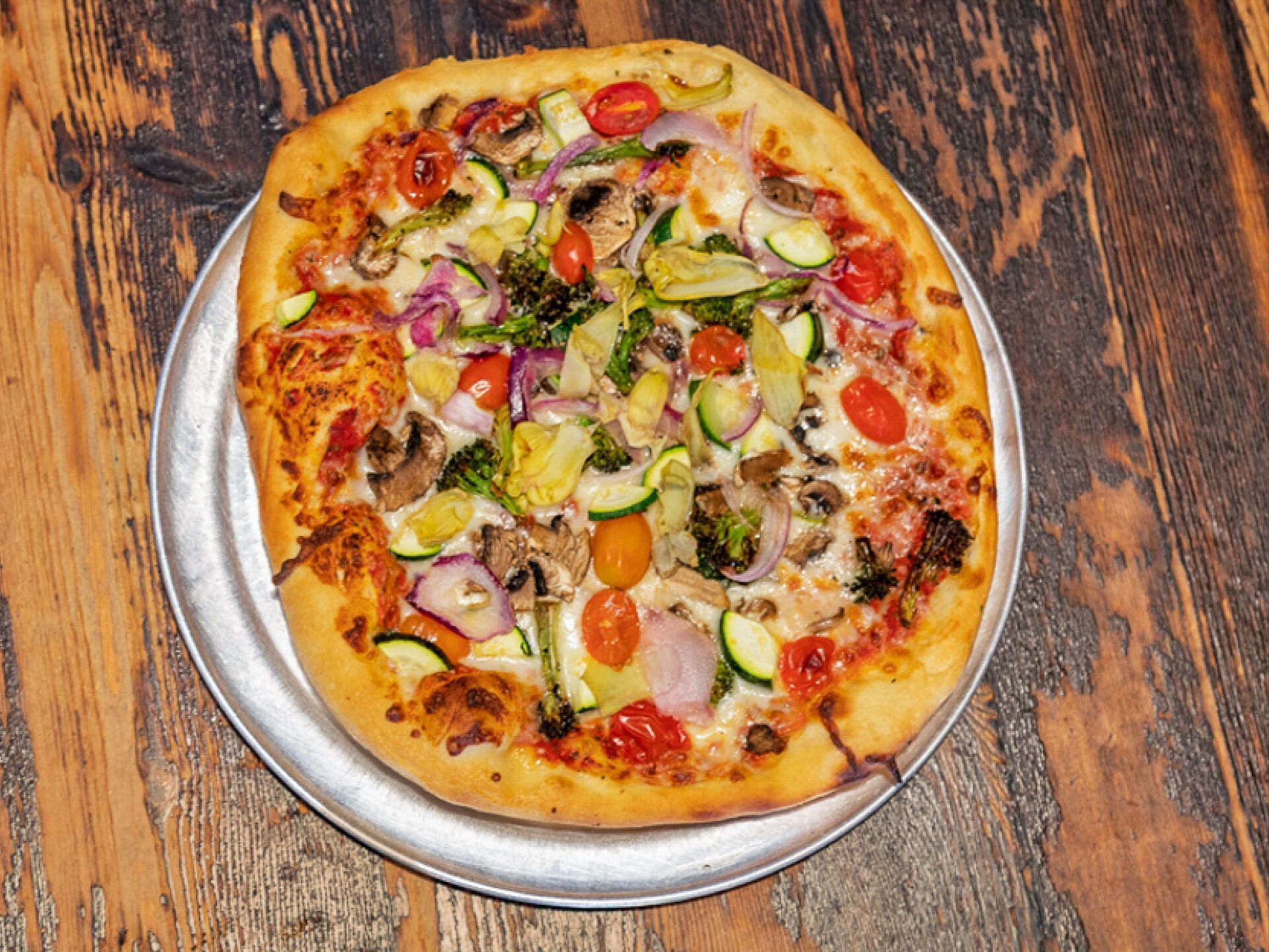 Classic Red Sauce, Shredded Motz, Broccolini, Mushrooms, Artichokes, Cherry Tomatoes, and Red Onions
