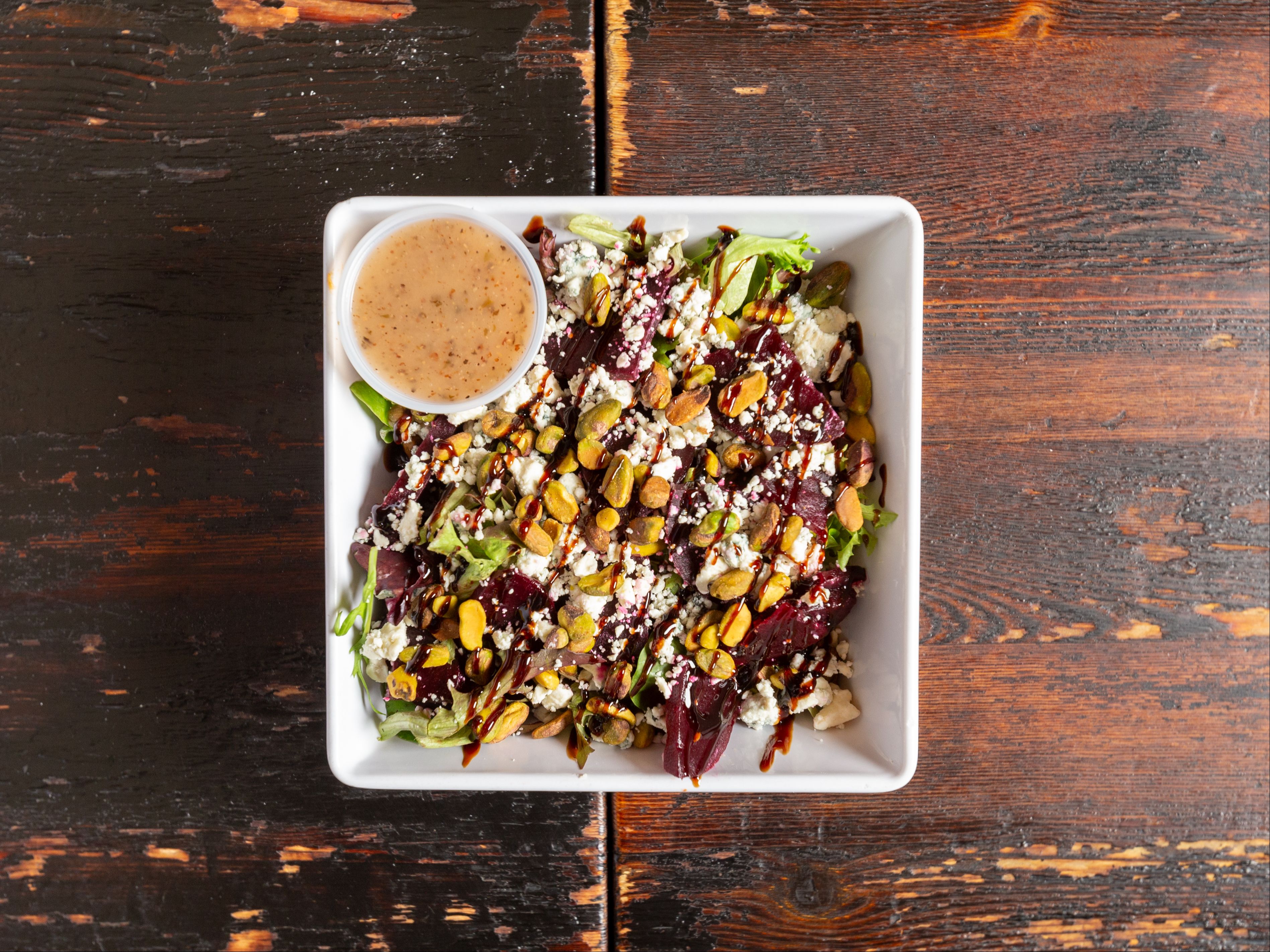 Wild arugula, roasted beets, Gorgonzola, pistachio nuts, house vinaigrette, & a drizzle of balsamic reduction.