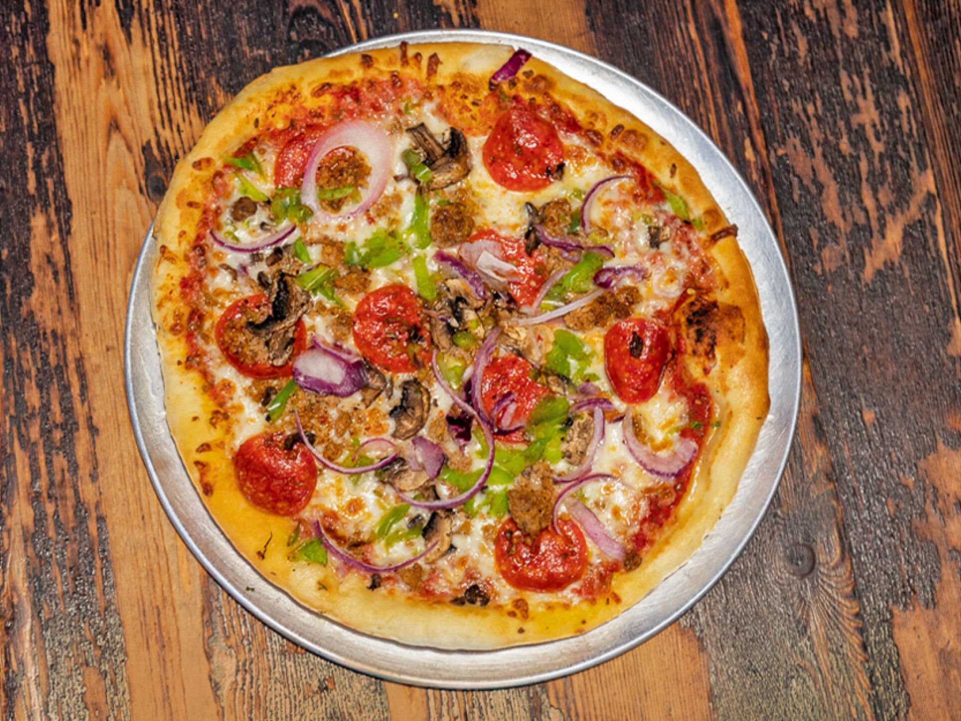 Classic Red Sauce, Shredded Motz, Italian Sausage, Pepperoni, Green Peppers, Red Onions, Mushrooms