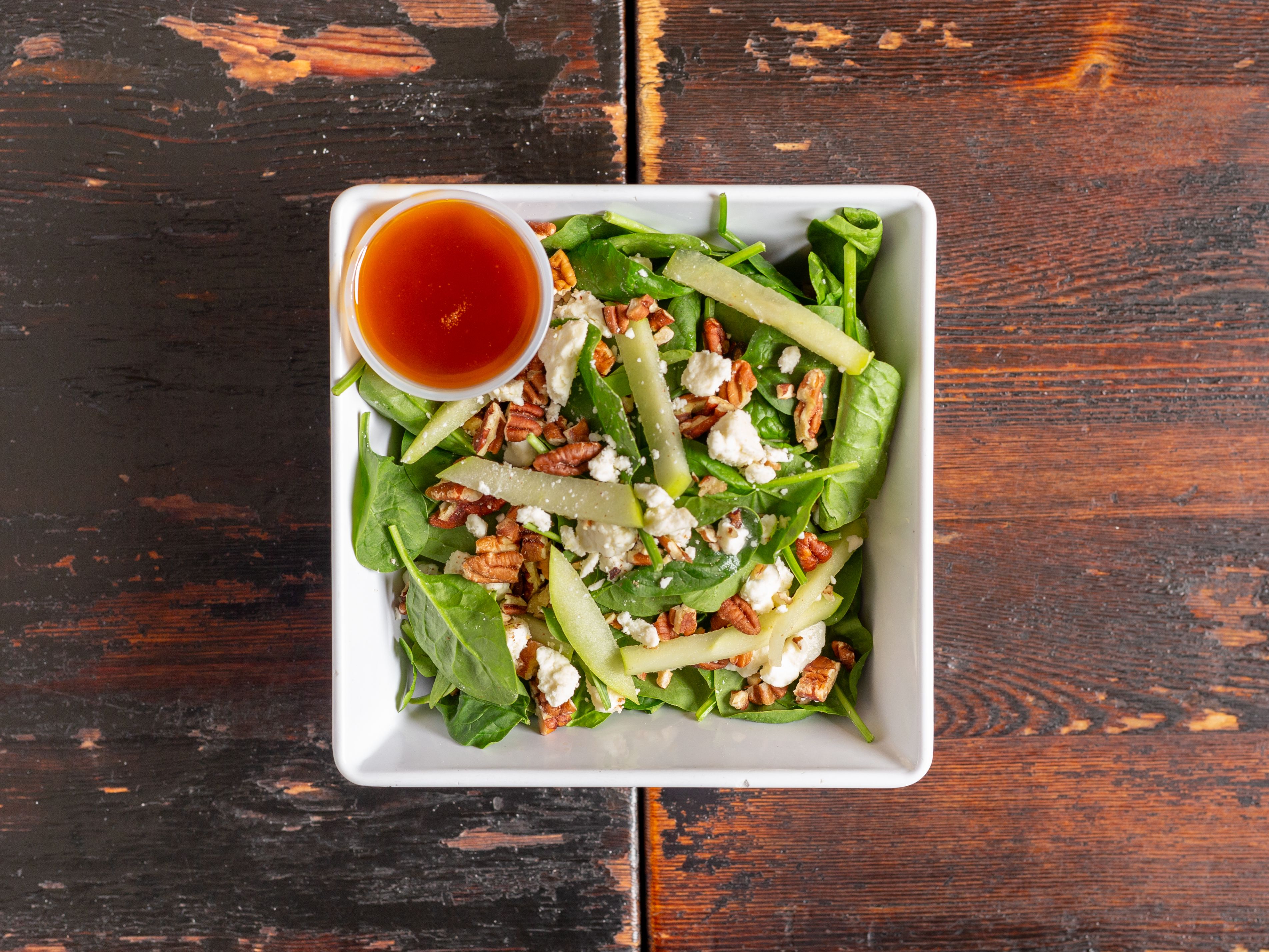 Fresh spinach, Granny Smith apples, Feta cheese, toasted pecans tossed in a sweet vinaigrette.
