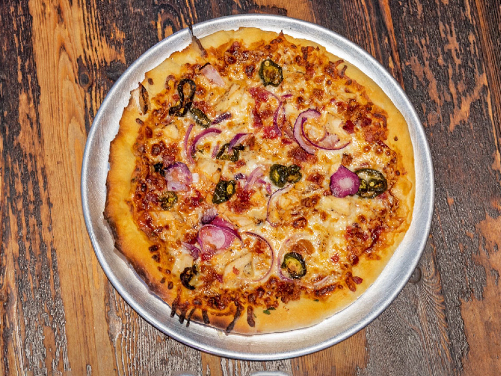 Barbecue Sauce, Shredded Motz, Bacon, Chicken, Re Onion\, and Jalapenos. *Sauce is not Vegan