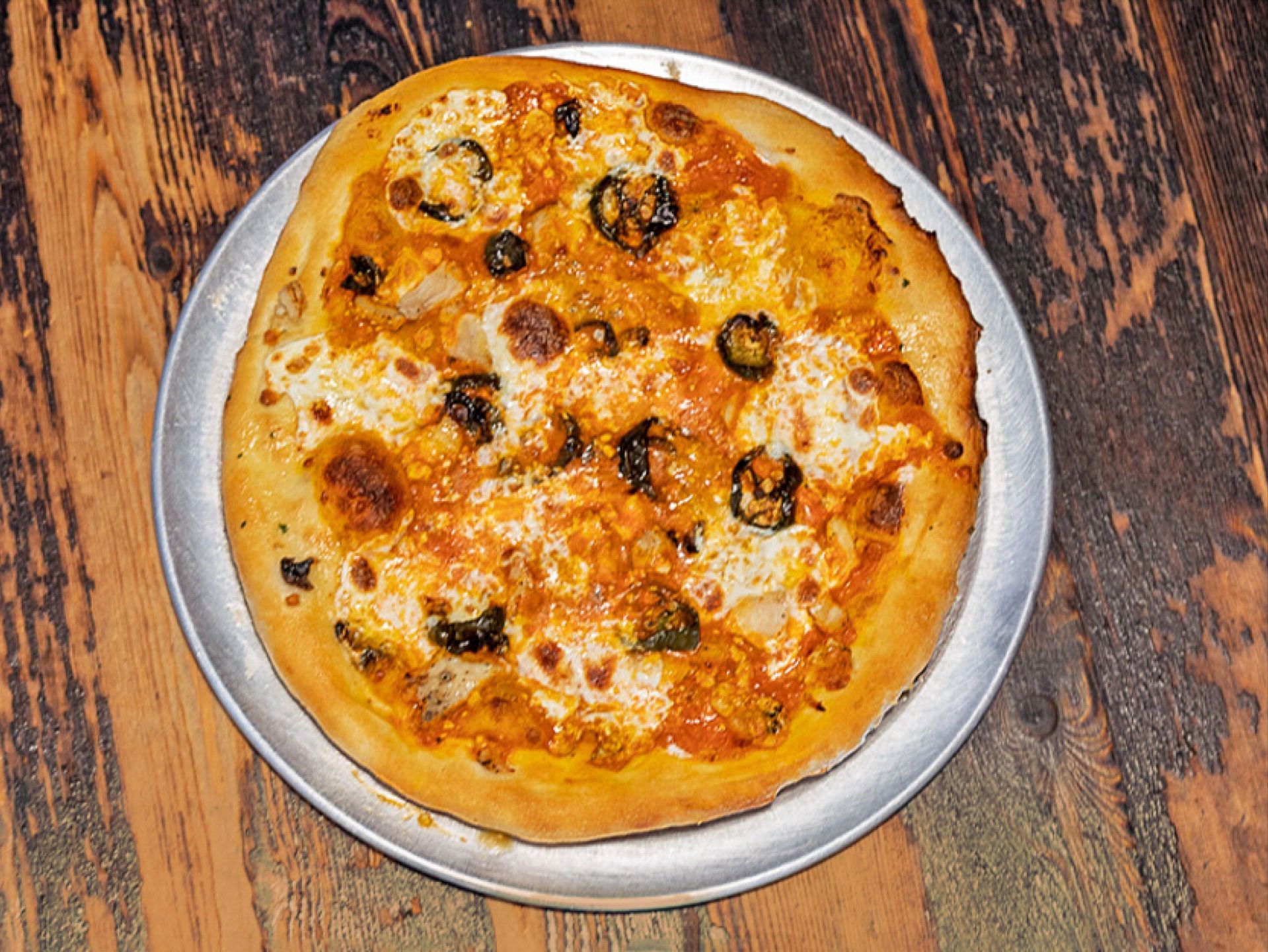 Spicy Buffalo Sauce, Fresh Motz, Chicken, Jalapenos, and Gorgonzola Cheese
