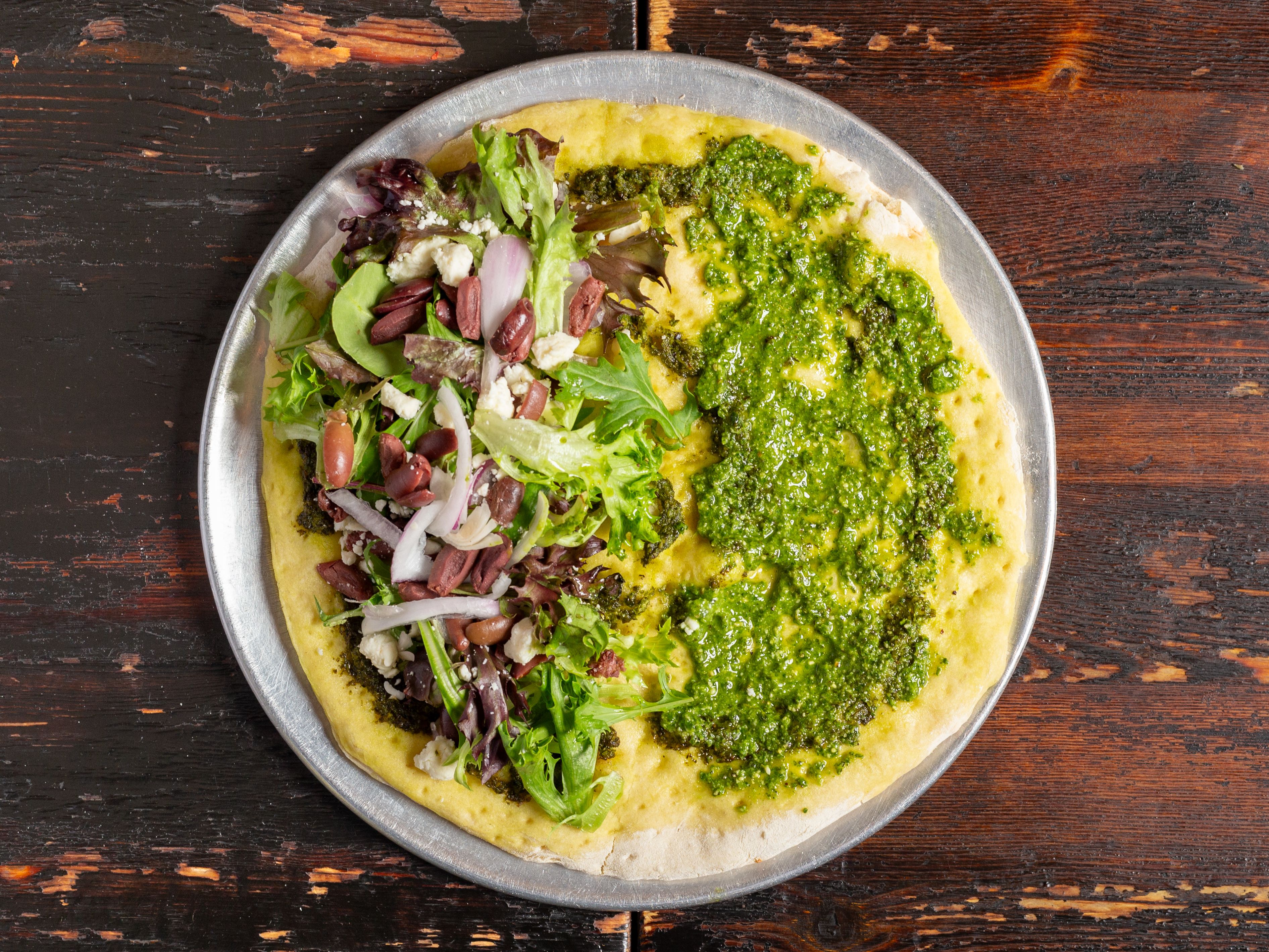 Crispy warm pizza dough brushed with pesto sauce, wrapped around a Greek salad. *Pesto contains cheese