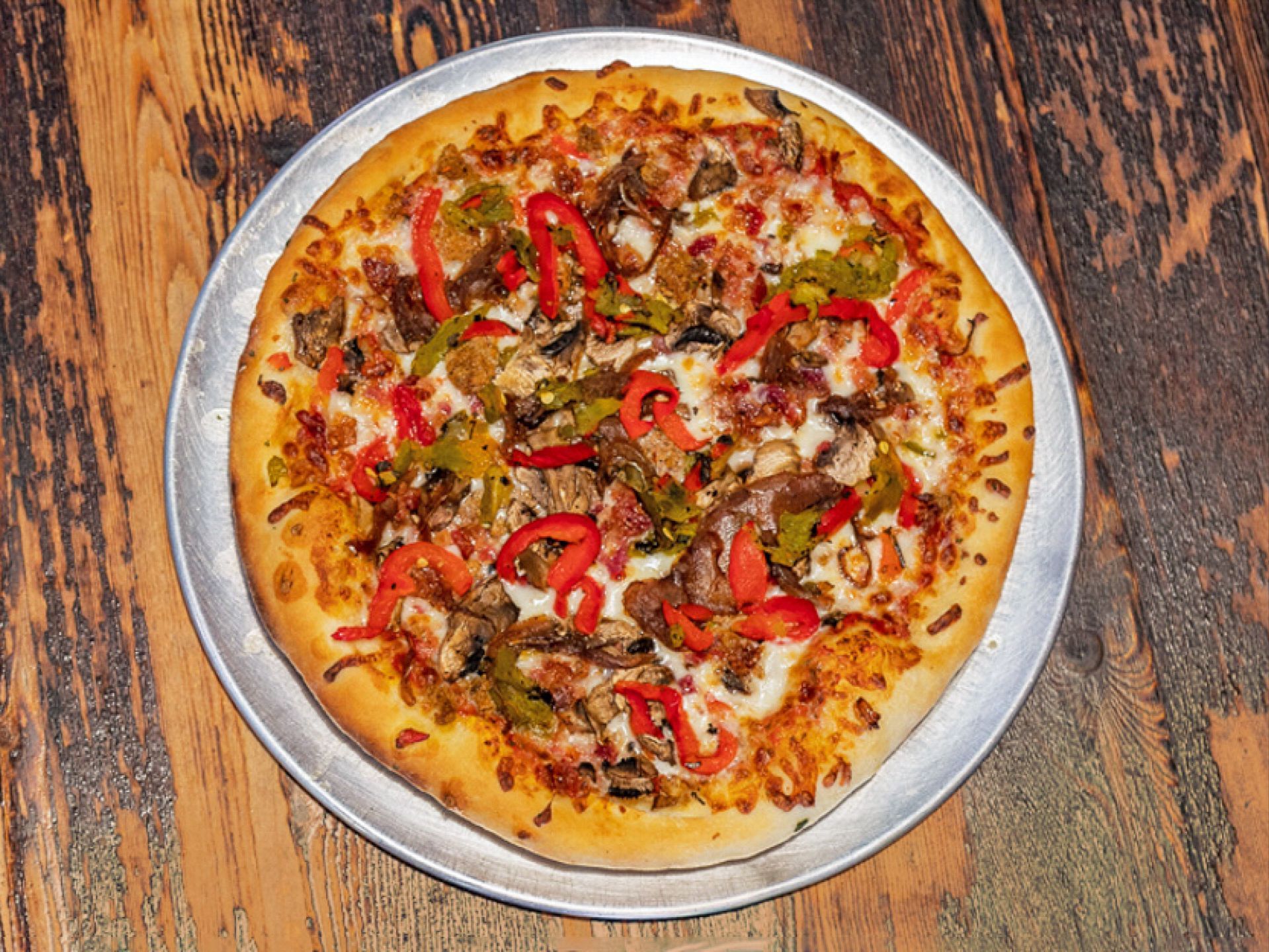 Classic Red Sauce, Shredded Motz, Sausage, Bacon, Roasted Red Peppers, Caramelized Onions, Mushrooms, Pueblo Chiles