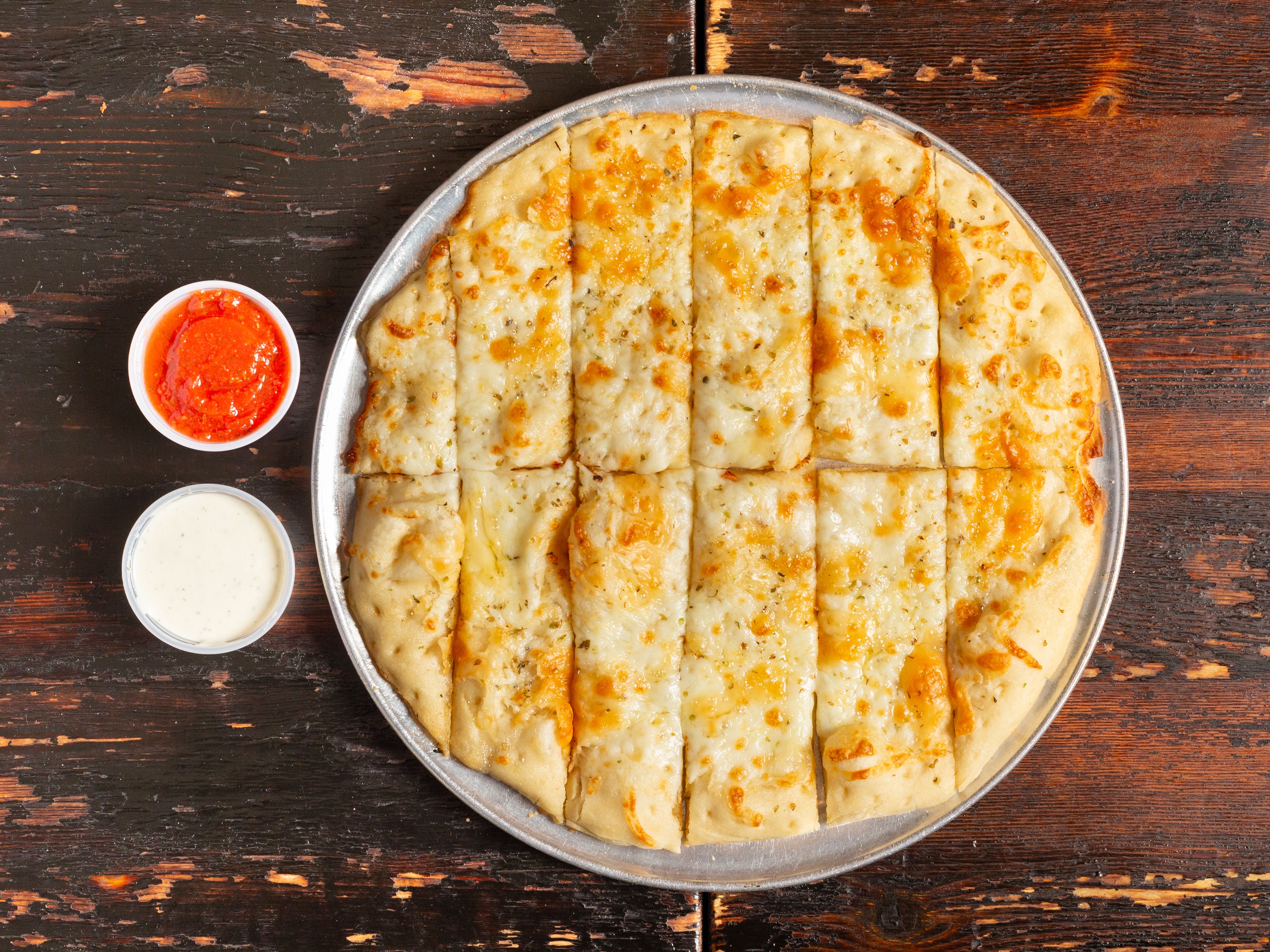 Cheesey bread strips served with red sauce for dipping