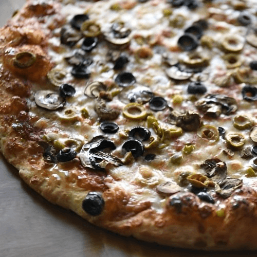 Alfredo sauce, Mozzarella, green peppers, mushrooms, onions, black olives, and tomatoes