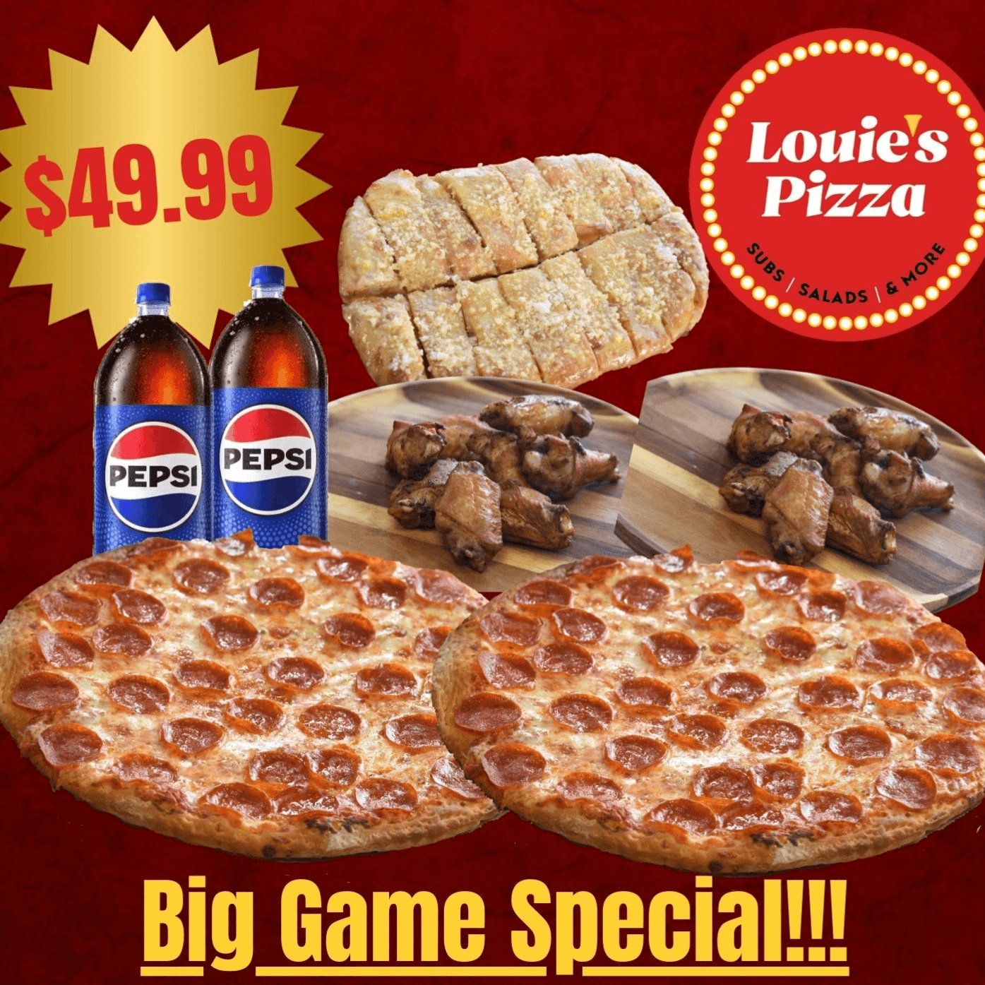 • Big Game Special (2 Pizzas, 2 Wings, Garlic Bread, 2 Sodas)