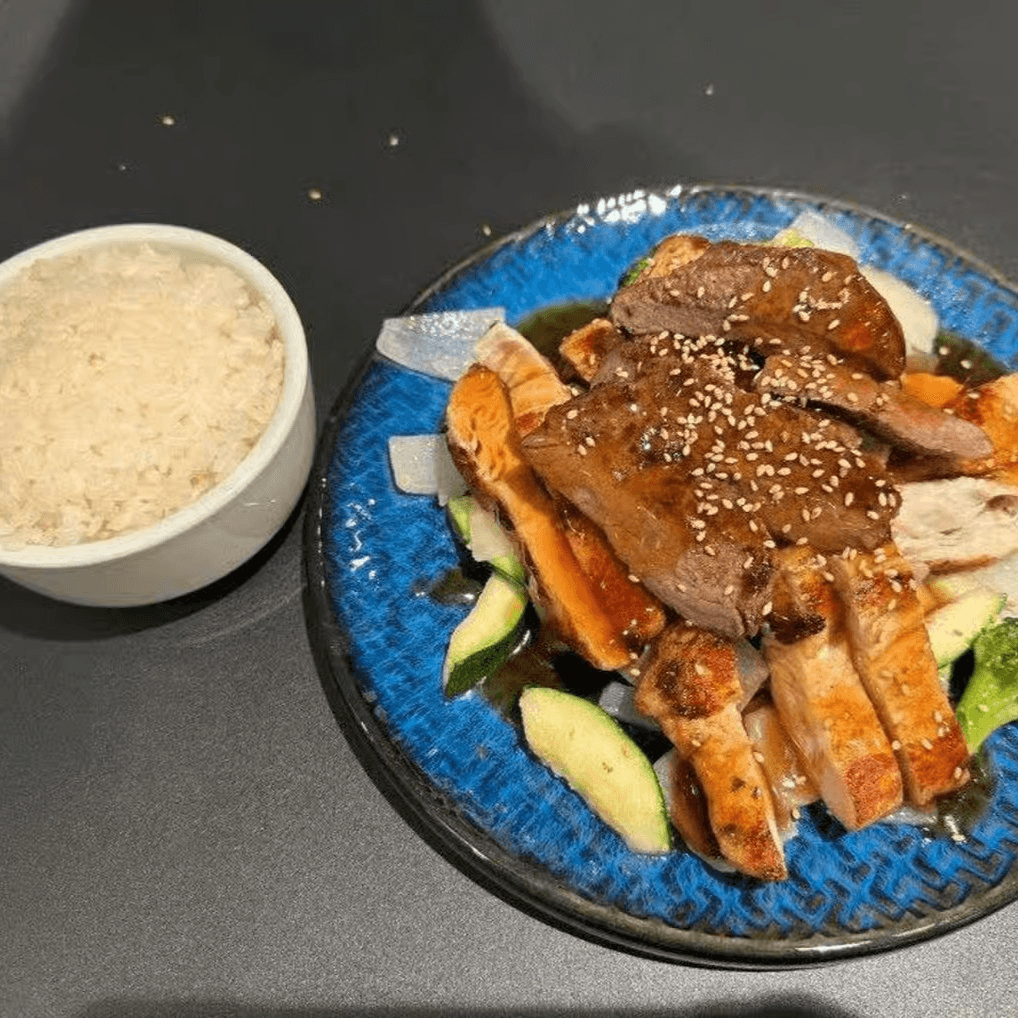 Served with steamed rice or fried rice, California rolls, 3 pieces dumpling & 1 vegetable spring roll