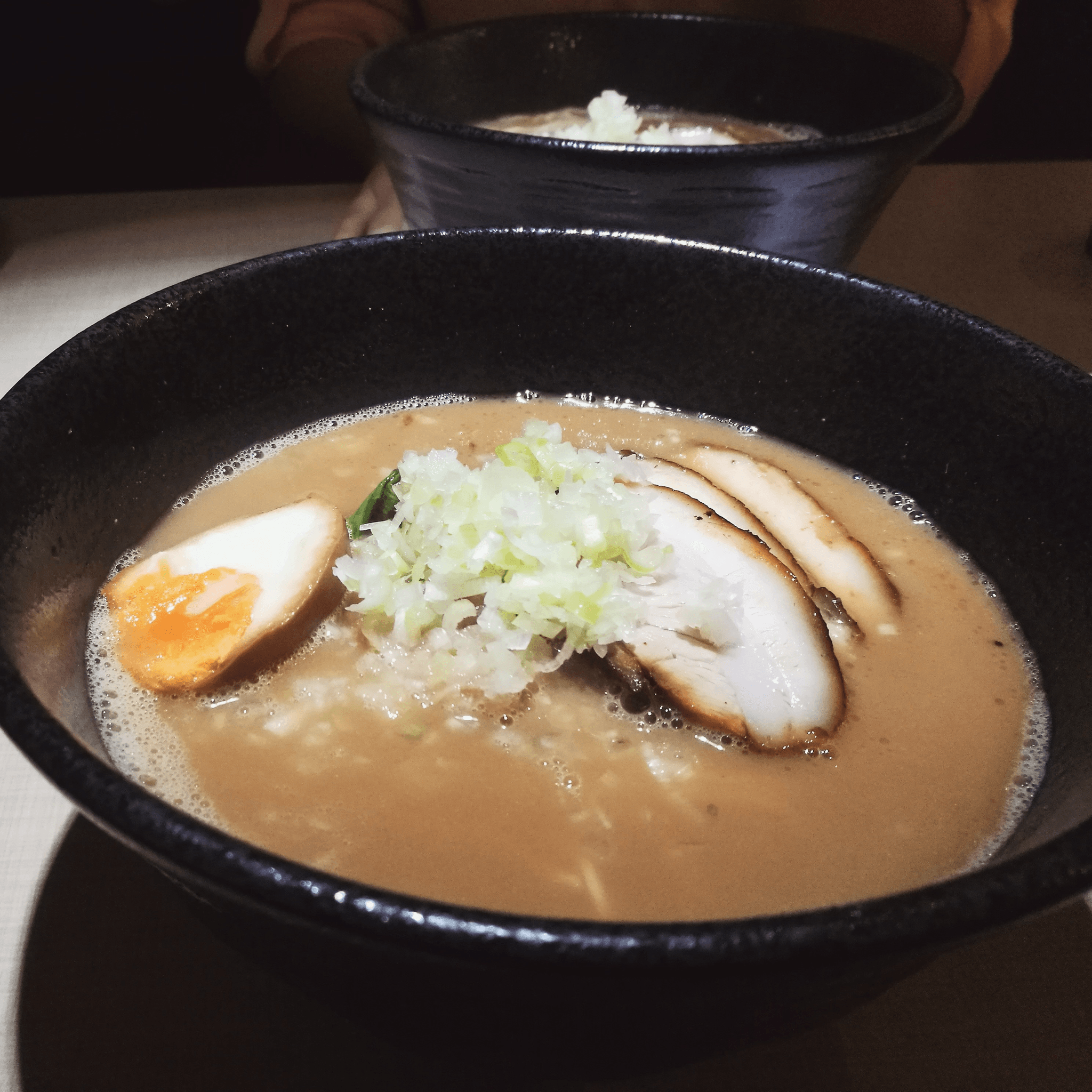Marinated pork belly, green onion, bean sprouts, bok choy, corn, soft boiled egg, and nori